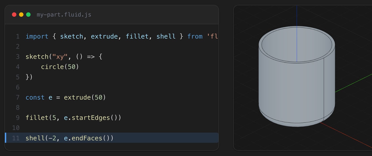 • FluidCAD (above) is a new project bringing parametric CAD to the JavaScript world where you can write code to create/manipulate objects and see a live update of what you're making. It's built on top of OpenCascade.js, a JS/WASM port of the open source OpenCascade 3D geometry library.